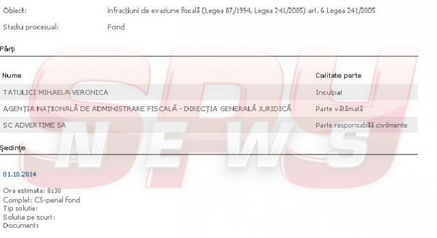 Tatulici este judecată pentru încălcarea legii pentru prevenirea şi combaterea evaziunii fiscale, în calitatea ei de proprietar al societăţii Advertime SA, mai exact pentru încălcarea articolului 6. Potrivit acestuia, "constituie infracţiune şi se pedepseşte cu închisoare de la un an la 3 ani sau cu amendă reţinerea şi nevărsarea, cu intenţie, în cel mult 30 de zile de la scadenţă, a sumelor reprezentând impozite sau contribuţii cu reţinere la sursă". Pe româneşte, Veronica Tatulici nu şi-a plătit - potrivit procurorilor, cu rea intenţie - dările către stat. Următorul termen al procesului a fost fixat pentru începul lunii octombrie.