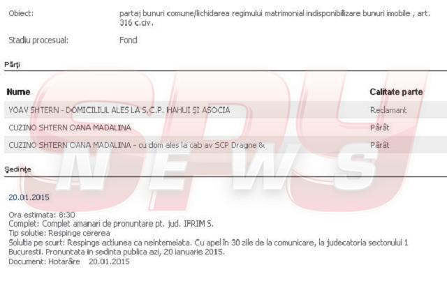 Magistraţii bucureşteni au respins cererea depusă de omul de afaceri Yoav Shtern în procesul de partaj cu Oana Cuzino, deschis în urmă cu şase luni.