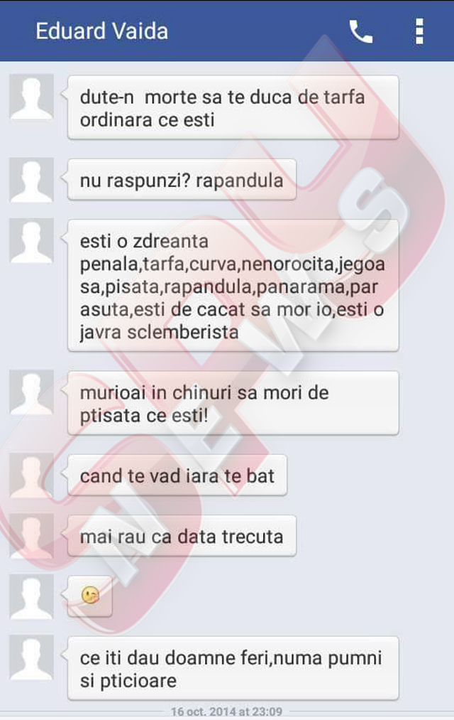 Criminalul nu s-a mulţumit cu răspunsul fetei şi, după ce a stat liniştit o scurtă perioadă, a trecut din nou la ameninţări. De data aceasta, mesajele lui Eduard Vaida au fost mult mai agresive şi arată faptul că îi pusese gând rău cu mult înainte de a o strânge de gât, în spatele policlinii din Baia Sprie.