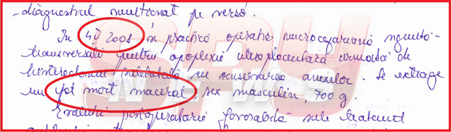 Din biletul de externare din data de 13 mai 2002 reiese faptul că femeia a dat naştere unui făt mort macerat, la exact 28 de săptămâni de sarcină. Însă, în mod bizar, într-un alt document medical eliberat înainte cu trei luni, mai exact pe 30 ianuarie, se menţiona o sarcină de 20 de săptămâni, fapt dovedit de actele emise de Spitalul Municipal Medgidia.