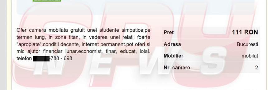 Contactat de un reporter incognito de la SPYNEWS, care s-a dat drept intermediar, individul s-a arătat interesat de o fată de 16 ani. "Anunţul este valabil. Locuinţa este în Bucureştii Noi. Poate să vină să vadă camera joi seară, pentru că până atunci nu pot, sunt prins cu serviciul", a explicat perversul. Cu toate că jurnalistul incognito a repetat de câteva ori că noua "chiriaşă" este minoră, dar că este dispusă să facă sex pentru a avea unde locui, "gazda" a explicat că nu are vreo problemă în această privinţă. De altfel, în aceeaşi zi, pe un alt site, acelaşi individ a postat un anunţ în care susţinea că oferă o altă cameră, în zona Titan, "unei studente simpatice". Semn că individul ori e un "peşte" cu experienţă, care are "fete" prin tot Bucureştiul, fie se crede un mic sultan, dispus să plătească pentru a avea un harem generos. "Ofer cameră mobilată gratuit unei studente simpatice, pe termen lung, în zona Titan, în vederea unei relaţii foarte apropiate. Condiţii decente, internet permanent. Pot oferi şi mic ajutor financiar lunar. Economist, tânăr, educat, loial", este anunţul individului.