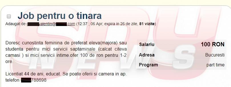Individul, care se recomandă drept "Valentin Grozav" şi susţine că este "licenţiat şi educat" a postat, în Vinerea Mare, un anunţ în care explica faptul că doreşte să "ajute" o elevă sau studentă, căreia să îi ofere un acoperit deasupra capului. "Generos", bărbatul explicat că nu vrea bani pentru găzduire, ci doar ca fata să îi calce săptămânal câteva cămăşi şi să îi ofere nişte partide de sex. Nu gratis! Pentru că e un bun creştin, a explicat că îi oferă elevei 100 de lei în schimbul partidelor de amor, "serviciile intime" putând dura până la două ore.