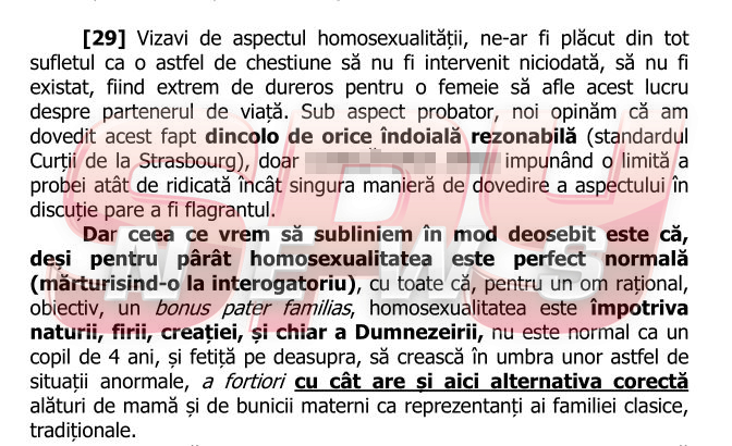 Decizia magistraţilor este cu siguranţă o premieră în justiţia românească şi a venit în timpul procesului de divorţ dintre omul de afaceri şi soţia sa, cea cu care are un copil de patru ani. "Căsnicia s-a stricat în 2012, când el a început o relaţie homosexuală. Un an mai târziu am ajuns la divorţ. Am crezut că lucrurile sunt clare şi că în România se face justiţie. Autoritatea tutelară a spus că fetiţa ar trebui să rămână la mine şi evaluarea psihologică a arătat că mama este un părinte mai bun. În faţa instanţei el nu şi-a negat homosexualitatea. Cu toate astea, în prima instanţă judecătorii au decis că fetiţa trebuie să rămână la el, iar eu trebuie să-i plătesc pensie alimentară (mama este manager într-o companiei multinaţională - n.r.). Mai grav, de când este în grija lui, fetiţa este neglijată", ne-a mărturisit V.I., care crede că decizia magistraţilor a fost influenţată de soţul ei, un apropiat al primarului Gheorghe Falcă, finul lui Traian Băsescu. Dosarul se află acum în faza de apel, milionarul - un abonat al contractelor cu statul în perioada PDL - urmând să fie audiat în perioada imediat următoare.