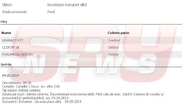 Judecătorii bucureşteni au admis cererea Granaco KFT, una din cele mai importante companii de pe piaţa europeană a cerealelor, şi a dispus executarea silită a lui Adrian Porumboiu şi a Ulerom SA, una din societăţile deţinute de fostul finanţator al FC Vaslui. Ca efecte, executarea silită poate duce la blocarea conturilor aparţinând atât lui Porumboiu cât şi pe cele ale Ulerom.
