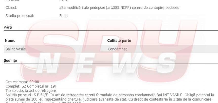 Vasile Balint, alias Sile Cămătaru, i-a surprins pe reprezentanţii penitenciarului în care este încarcerat după ce a renunţat, din senin, la un proces extrem de important. Sile deschisese, în urmă cu doar câteva săptămâni, un proces în care solicitase contopirea pedepselor, pentru a putea ieşi mai repede din spatele gratiilor. Zilele trecute, însă, liderul interlop a depus o cerere în care solicita închiderea dosarului, din motive necunoscute. „Ia act de retragerea cererii formulate de persoana condamnată BALINT VASILE. Obligă petentul la plata sumei de 100 lei, reprezentând cheltuieli judiciare avansate de stat. Cu drept de contestaţie în 3 zile de la comunicare. Pronunţată în şedinţă publică", au decis, zilele trecute, magistraţii.