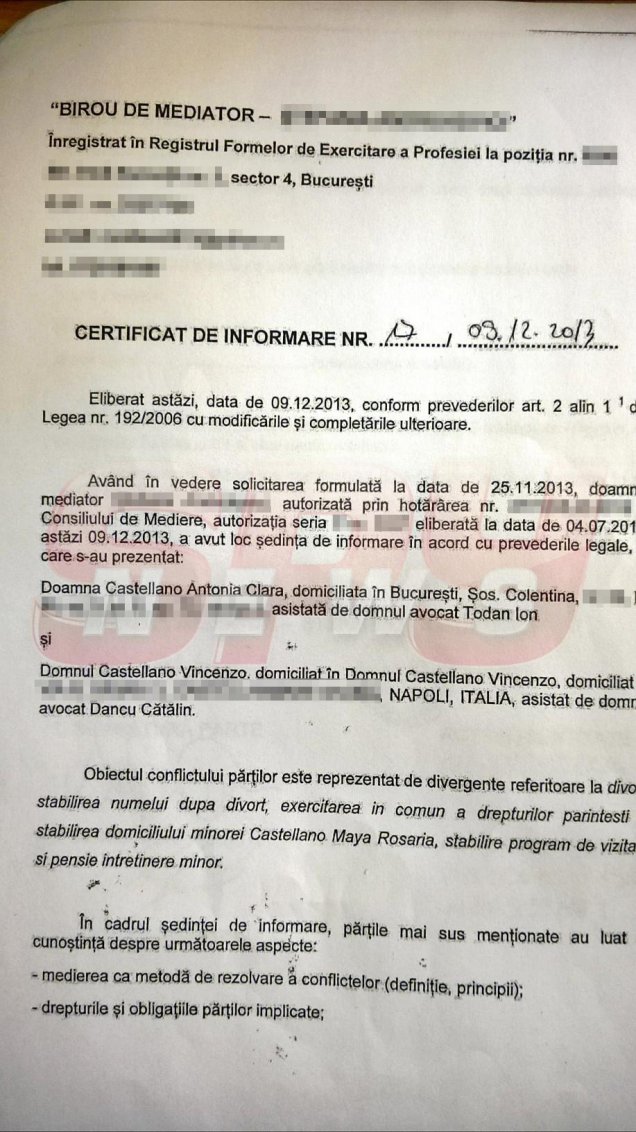 Cu unsprezece zile înainte de a depune divorţul, pe 09.12.2013, Antonia şi Vincenzo Castellano au fost în biroul mediatorului Ştefania A., din Sectorul 4. Împreună au semnat certificatul de informare nr. 17/09.12.2013 prin care au ales să-şi rezolve problemele în faţa instanţei de judecată. Documentul de o singură filă conţine negru pe alb domiciliile celor doi. Ea în Bucureşti, el la Napoli. Filă pe care Antonia cu siguranţă a citit-o înainte să o semneze. De ce după nici două săptămâni a ales să uite adresa soţului ei? Numai Antonia poate răspunde, cu siguranţă! Cert e că, dacă Vincenzo ar fi avut domiciliul în ţara noastră, ar cântări greu în decizia magistraţilor de judeca procesul în România.