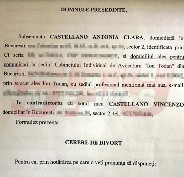 Spynews a prezentat încă din vara anului trecut documente incredibile, care demonstrează fără niciun dubiu că Antonia Clara Castellano, soţia lui Vincenzo Castellano, a încercat să-i inducă în eroare pe magistraţii de la Judecătoria Sectorului 2. În actul de chemare în judecată, Antonia a prezentat eronat domiciliul soţului său, ca fiind în Bucureşti, Sector 2. O greşeală nevinovată la prima vedere. Numai că în momentul în care a intentat acţiunea de divorţ, la 20.12.2013, Antonia ştia foarte bine unde îşi are domiciliul soţul ei. Există şi un act care dovedeşte asta.