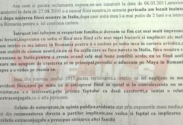 "Încă din cursul anului 2012, relaţiile dintre părţi au fost grav deteriorate în principal datorită faptului că reclamanta pârâtă a început să-şi neglijeze în mod constant familia, respectiv timpul petrecut şi acordat fiicei noastre, de subsemnatul nu mai vorbim, aspect argumentat şi de faptul că s-a angajat într-o relaţie extraconjugală, aspect de notorietate", se arată în dosarul de divorţ.