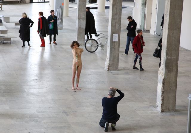 Pe lângă manechinele care au defilat în ţinute sofisticate, din materiale scumpe, spectatorii au asistat la o şedinţă foto extrem de îndrăzneaţă. O femeie complet goală s-a lăsat pozată în văzul tuturor. Nu se ştie exact care este motivul pentru care a renunţat la haine şi a început să-şi "picteze" corpul cu un marker, însă imaginile au făcut înconjurul lumii.