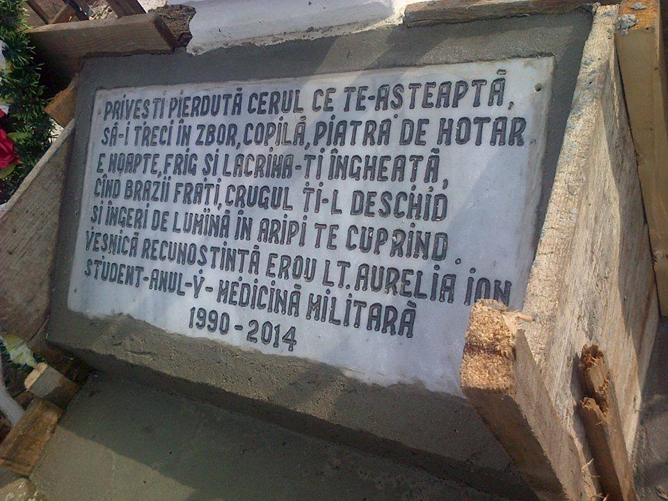 "Priveşti pierdută cerul ce te-aşteaptă să-i treci în zbor, copilă, piatra de hotar e noapte, frig şi lacrima-ţi îngheaţă, când brazii fraţi, crugul ţi-l deschid şi îngeri de lumină în aripi te cuprind veşnică recunoştinţă. Erou Lt. Aurelia Ion. Student-Anul V-Medicină Militară. 1990-2014"
