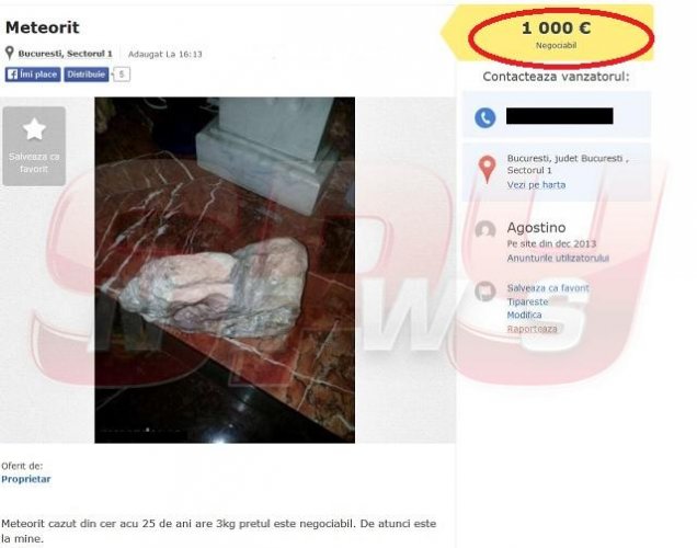 Pentru mulţi a părut a fi sfârşitul lumii, însă pentru un italian stabilit în România este doar o oportunitate inedită pentru a face bani. După ce în urmă cu două seri un meteorit a explodat deasupra României, bărbatul a scos la vânzare pe internet o bucată dintr-un meteorit căzut din cer în urmă cu 25 de ani. Anunţul italianului este extrem de ofertant, mai ales că, potrivit spuselor lui, piatra este una norocoasă. "În urmă cu 25 de ani un meteorit a căzut în curtea mea. Se întâmpla în Italia, acolo unde am locuit o perioadă. Atunci, bucata care cântăreşte 3 kilograme era negricioasă, deloc interesantă. Între timp aceasta s-a mai albit şi a fost ca o amuletă norocoasă. De 25 de ani nu a mai fost nevoie să muncesc. Afacerile mi-au mers extrem de bine. Ţin minte că un vecin de-al meu a luat cealaltă bucată. Acum vreau să o vând pentru 1.000 de euro. Sunt mult prea bătrân pentru asta", a mărturisit Agostino, în exclusivitate, pentru SPYNEWS.ro.