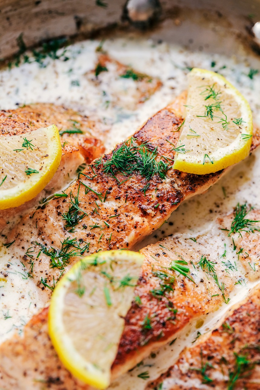 Într-o tigaie medie, se încălzește uleiul de măsline, la foc mediu. Se asezonează somonul cu sare și piper și se pune în uleiul încins. Se gătește timp de cinci minute pe fiecare parte. După ce peștele este gătit se transferă pe o farfurie și se lasă deoparte. Se adaugă usturoiul, în tigaia în care s-a gătit somonul și se călește timp de aproximativ un minut. Apoi se adaugă supa de pui, smântâna și sucul de lămâie, se amestecă și se lasă la fiert. Într-un castron se combină amidonul de porumb și apa, iar apoi se adaugă peste sosul din tigaie. Se gătește aproximativ patru minute până ce acesta capătă consistență. Se adaugă somonul și se mai ține pe foc aproximativ două minute. Se asezonează cu mărar proaspăt și se servește imediat.