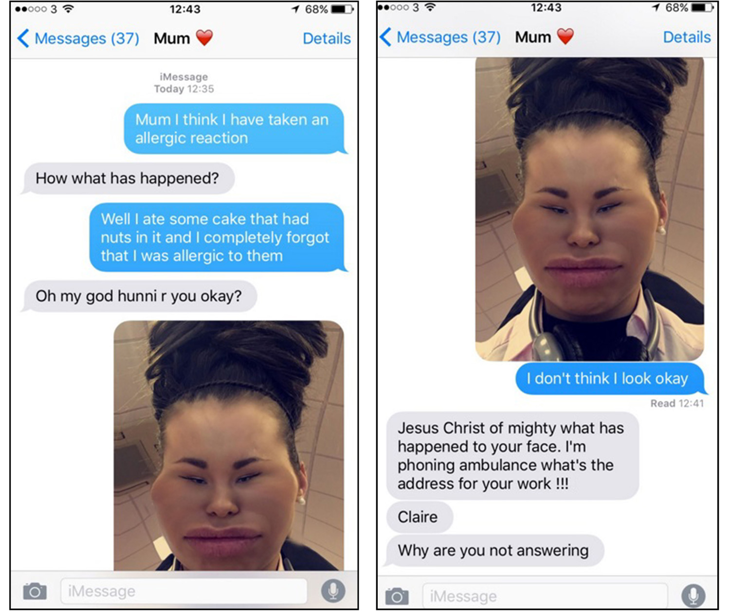 Claire Maughan, o tânără din Edinburgh, Marea Britanie, i-a trimis mamei sale o fotografie în care avea faţa umflată şi a speriat-o de moarte.