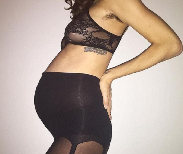 În imagini, Alexandra apare în sutien şi chiloţi, iar la un moment dat arată la camera foto degetul din mijloc. "Cred că este foarte fericită că e la finalul sarcinii!", a scris el la descrierea imaginii de pe Instagram.