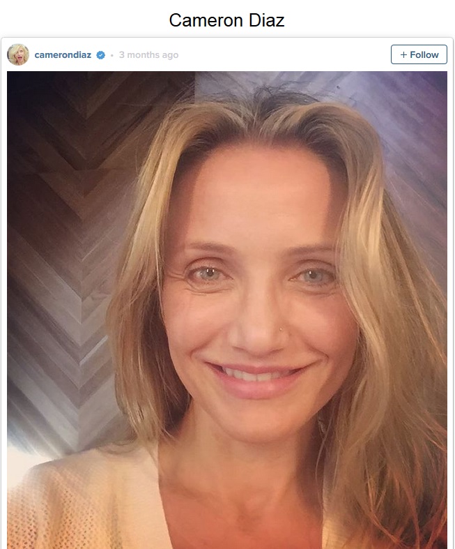 7. Cameron Diaz este de nerecunoscut fără machiaj. Ridurile adânci de pe faţă nu o stânjenesc deloc pe actriţă, care se afişează cu bucurie şi fără machiaj.