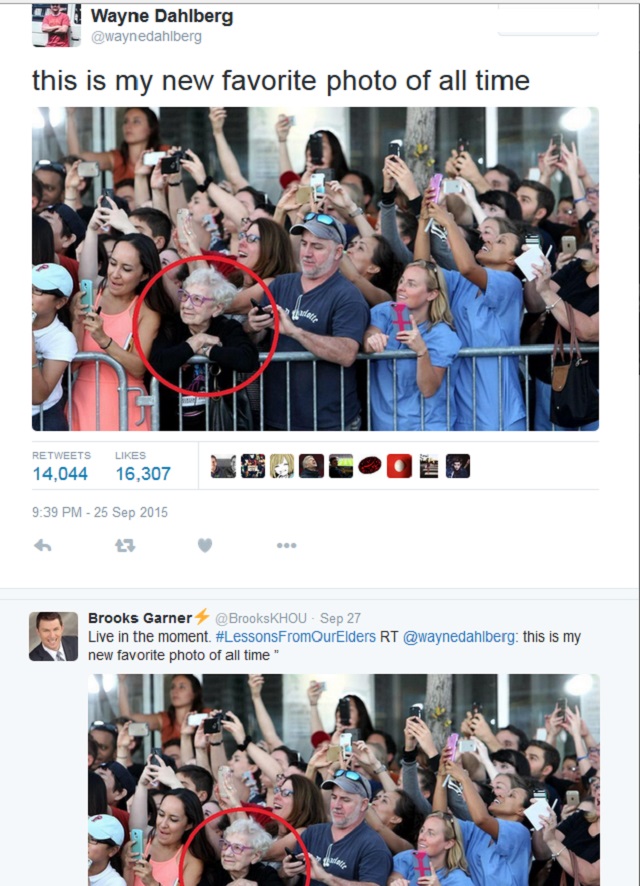 În imagine sunt surprinşi zeci de oameni prezenţi la Corner Theatre din Brookline, Massachusetts, la premiera filmului "Black Mass arriving". Oamenii prezenţi la eveniment erau preocupaţi cu toţii să surprindă momentele spectaculoase cu camerele de fotografiat, mai puţin o bătrânică ce a savurat momentul privind liniştită, potivit independent.co.uk.