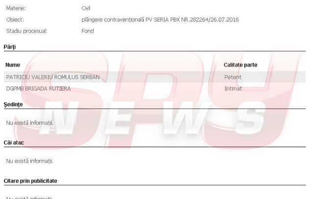 Extrem de discret, Şerban Patriciu ar putea ajunge mai nou în faţa judecătorilor într-un proces pe care acesta l-a intentat Brigăzii Rutiere Bucureşti. Potrivit datelor oferite de portalu instanţelor, omul de afaceri a formulat o plângere contravenţională împotriva unei sancţiuni primită la finalul lunii iulie. Un prim termen de judecată nu a fost încă stabilit.