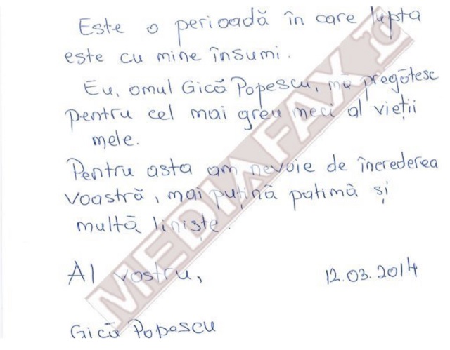 Printr-o scrisoare emoţionantă, Gică Popescu le-a mulţumit tuturor pentru intenţiile bune, însă susţine că îşi asumă responsabilitatea pentru faptele sale şi că nu dpreşte să fie graţiat.