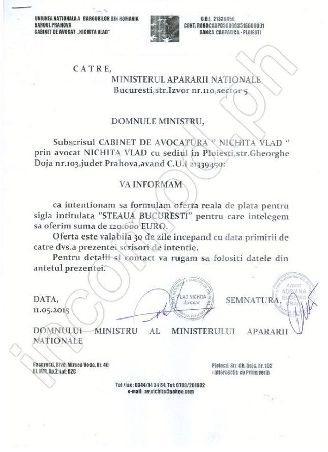Avocatul ploieştean Vlad Nichita le-a trimis reprezentanţilor MApN o ofertă de achiziţionare a mărcii Steaua, în valoare de 120.000 de euro. Marca se află în posesia Clubului Sportiv al Armatei din 3 decembrie 2014. Oferta cabinetului de avocatură pentru marca Steaua ar cea de-a doua primită de MApN în ultima săptămână. Oferta avocatului a fost publicată pe siteul incomod.ph