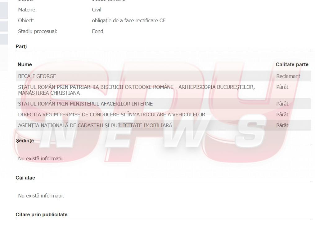 Becali mai are două procese asemănătoare. După cum SPYNEWS a dezvăluit recent, latifundiarul din Pipera a dat-o în judecată pe Cosmina Englizian, solicitând ca aceasta să îi returneze un imobil care i-ar aparţine, de fapt, lui. Alături de designer a fost chemat în judecată şi un afacerist care a avut legături cu Dinu Patriciu, iar cum miza este uriaşă pentru Gigi Becali, procesul s-ar putea transforma într-un adevărat scandal. Dosarul a fost înregistrat la Tribunalul Ilfov, iar magistraţii nu au stabilit deocamdată când va avea loc primul termen.