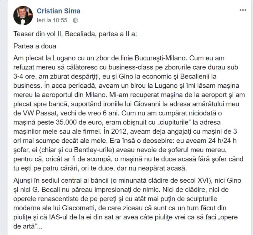 (...) La câteva luni după asta, Brianti îmi spune că Becali a venit la el cu un cec de 500.000 pentru a-l cashui imediat. Cum banca nu l-a cashuit imediat şi a cerut să aibă timp să-l verifice, Becali a făcut mare scandal, şi-a luat cecul şi a plecat. Elveţienii făcuseră deja o fotocopie după cec şi au descoperit că cecul era fără acoperire. Nu ştiu cum s-au comportat după, dar sigur nu cu mănuşi. Cum pe Giovanni Becali nu l-am mai văzut după, nu ştiu nici cum a evoluat relaţia dintre el şi bancă (de fapt, declarasem că nu mă interesează). Povestea nu se încheie aici", relatează Cristian Sima, în cartea sa.