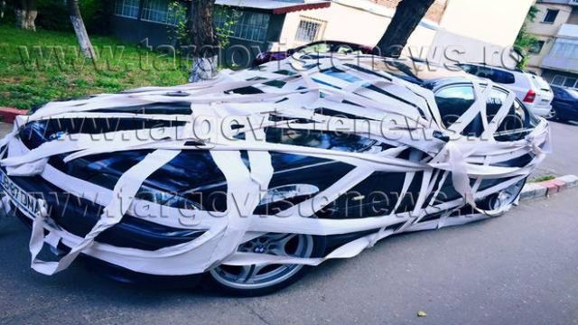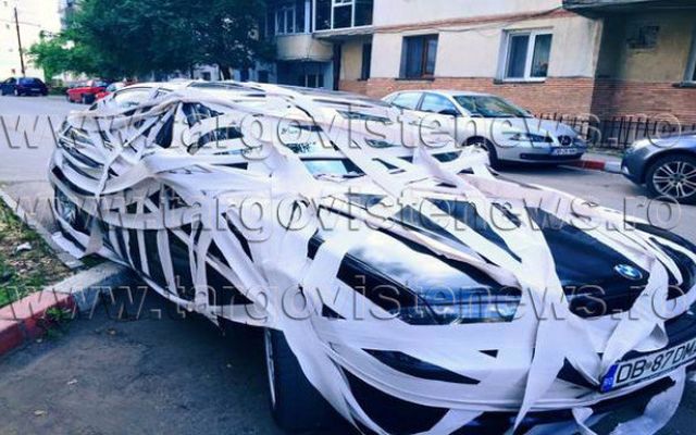 Maşina sa era plină de hârtie igienică. Autoturismul era învelit tot în hârtie, semn că cel care a pus la cale nebunia a petrecut ceva timp să facă acest lucru. Proprietarul maşinii a spus că s-a întâmplat să-şi găsească autoturismul şi cu roţile tăiate.