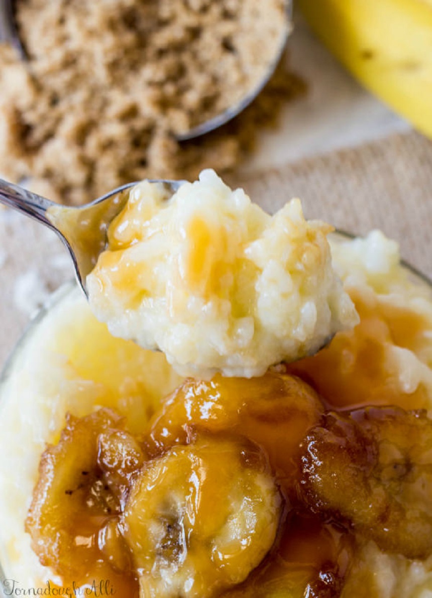 Se fierbe orezul conform instrucţiunilor de pe ambalaj. Dupe ce acesta este gata se transferă într-o cratiţă medie şi se adaugă 1 1/2 ceşti de lapte şi zahărul. Se găteşte la foc mediu timp de aproximativ 10-15 minute. Între timp se topeşte untul într-o tigaie, după care se adaugă zahărul brun şi vanilia se lasă căteva minute pe foc până ce toate aceste condimente se combină între ele. Se adaugă banana şi se mai lasă pe foc timp de 1-2 minute până ce aceasta se caramelizează. Odată ce orezul s-a îngroşat se toarnă restul de lapte şi oul şi se firbe până ce se onţine o cremă omogenă. Se îndepărteză de pe foc şi se amestecă orezul cu unt şi vanilie. Se serveşte imediat împreună cu bananele caramelizate.