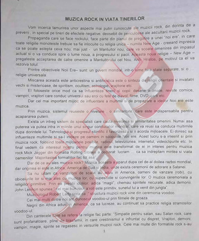 Iar exemplele date în cursurile de religie predate sunt incredibile. ”Muzica rock a ajuns în punctul cel mai oribil de a lăuda și recomanda adorarea satanei. Adorarea demonilor, în muzica rock, începe chiar cu regele Elvis Prisley (sic) (...), urmează Beatles”, stă scris în cursul cu pricina. De altfel, delirul include șiu alte formații sau artiști precum ABBA, Alice Cooper – care, chipurile, și-a și vândul sufletul unui demon - sau Elton John, șirul cântăreților fiind unul de-a dreptul imens.