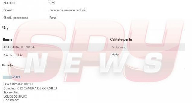 Judecătorii din Ilfov trebuie să analizeze o cerere de chemare în judecată deschisă pe numele fostului patron al echipei de fotbal Ştefăneşti, decedat la 17 iulie 2013. Culmea, potrivit surselor noastre, societatea comercială Apă Canal Ilfov SA solicită instanţei - nici mai mult, nici mai puţin - obligarea lui Nae Niculae la plata utilităţilor pe anul în curs. Oricât de bizar, cererea este cât se poate de reală şi trebuie tratată ca atare.