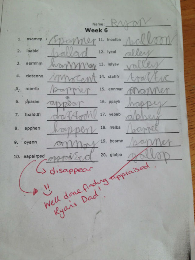 Copilul avea temă la limba engleză şi, ajutat de tată, a "identificat" câteva cuvinte care de regulă nu se regăsesc în vocabularul unui puşti de nouă ani. Învăţătoarei i-a atras atenţia termenul de "appraised" (n.r evaluat) şi a ţinut să "îl felicite" pe tatăl care a vrut să îi dea o mână de ajutor fiului său pentru cum se descurcă. "Foarte bine, domnule", scrie învăţătoarea.