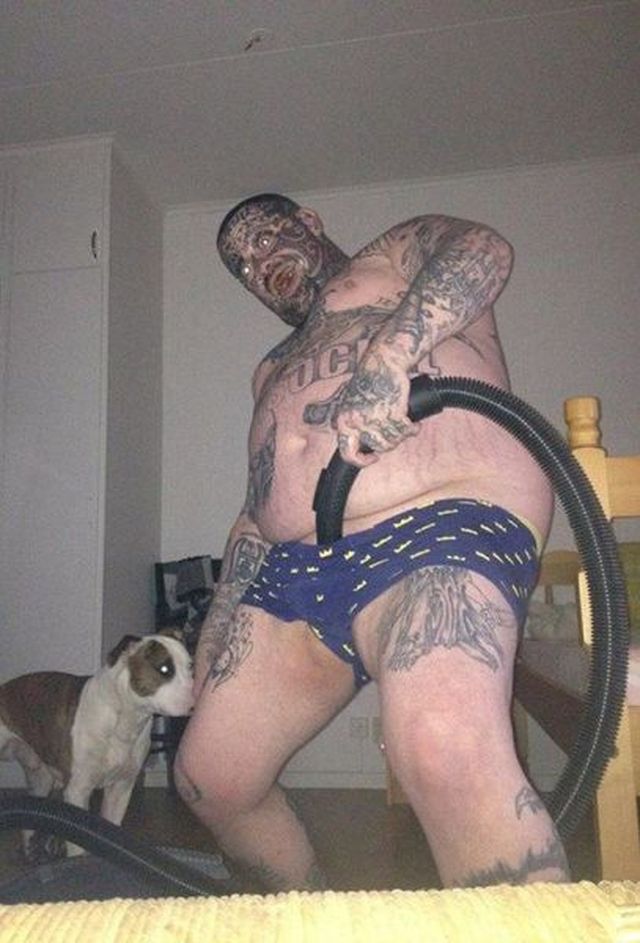 Nu ştim ce a fost în mintea bărbatului din imagine când s-a fotografiat aşa, dar i-a scârbit pe toţi cei care l-au văzut. Dornic de senzaţii tari, omul a renunţat la haine, şi-a luat aspiratorul şi a început să se autosatisfacă. La întreaga scenă a fost martor fără voie şi animaul de companie care, obligat de stăpân, a participat la actul dezgustător.