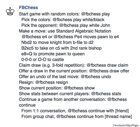 Dacă tastezi “@fbchess help” îţi vor apărea şi instrucţiunile, cât şi tastele pe care trebuie să apeşi.