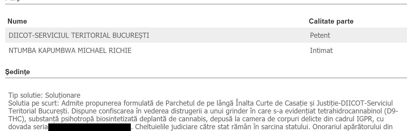 Michael Richie Ntumba Kapumbwa, alias Mike Diamondz, a fost citat recent la tribunal, într-un proces deschis de procurorii DIICOT, care au solicitat instanţei confiscarea unor bunuri găsite asupra artistului. Nişte "bunuri" speciale... "Admite propunerea formulată de Parchetul de pe lângă Înalta Curte de Casaţie şi Justiţie-DIICOT-Serviciul Teritorial Bucureşti. Dispune confiscarea în vederea distrugerii a unui grinder în care s-a evidenţiat tetrahidrocannabinol (D9-THC), substanţă psihotropă biosintetizată de plantă de cannabis, depusă la camera de corpuri delicte din cadrul IGP", s-a menţionat în sentinţa magistraţilor, semn că Mike Diamondz nu s-a învăţat minte, după condamnarea din 2004.