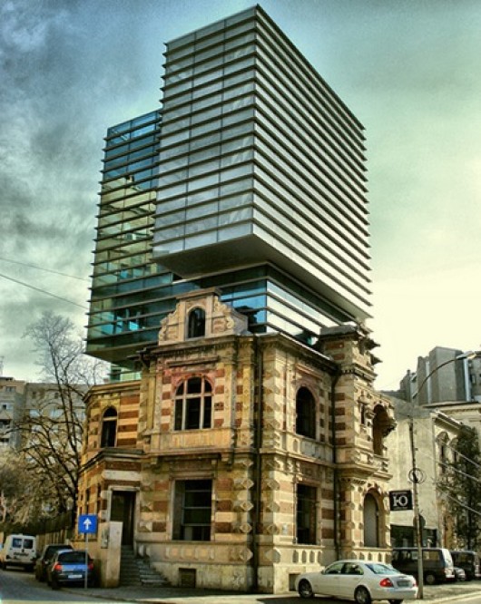 11. National Architects Union Headquarters (Bucharest, Romania)- Una dintre cele mai ciudate clădiri din Europa se află chiar în centrul Bucureştiului, în Piaţa Revoluţiei. Sediul Uniunii Arhitecţilor din România (UAR) este o clădire ultra modernă construită din oţel şi sticlă care se înalţă semeaţă din mijlocul unei case vechi aflate în ruină.