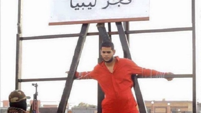 În imagini se vede un bărbat crucificat, îmbrăcat într-o salopetă portocalie. Alături de alte trei persoane, acesta a fost împuşcat de membrii grupării Statul Islamic. Corpurile victimelor au fost lăsate la vedere, ca un avertisment lansat celor care se opun mişcării.