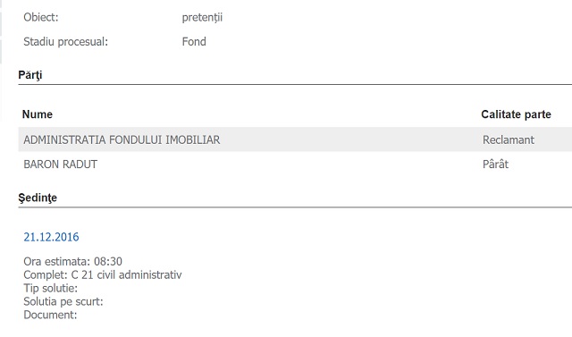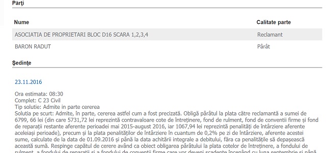 De altfel, un proces asemănător a pierdut Baron chiar zilele trecute, cu asociaţia de proprietari, pe care a "fentat-o" cu plata facturilor. "Obligă pârâtul (Baron Răduţ - n.r.) la plata către reclamantă (asociaţia de proprietari - n.r.) a sumei de 6.799, 66 lei (din care 5.731,72 lei reprezintă contravaloare cote de întreţinere, fond de rulment, fond de conventii firme şi fond de reparaţii restante aferente perioadei mai 2015-august 2016, iar 1.067,94 lei reprezintă penalităţi de întârziere aferente aceleiaşi perioade), precum şi la plata penalităţilor de întârziere în cuantum de 0,2% pe zi de întârziere, aferente acestei sume, calculate de la data de 01.09.2016 şi până la data achitării integrale a debitului, făra ca penalităţile să depaşească această sumă. (...) Obligă pârâtul să plătească reclamantei suma de 400 de lei cu titlu de cheltuieli de judecată", au dispus judecătorii.