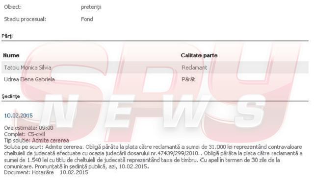 Elena Udrea a mai primit o veste proastă. Potrivit deciziei Judecătoriei Sectorului 5, ea trebuie să-i plătească Monicăi Tatoiu 31.000 de lei, în procesul în care Tatoiu îi cere fostului ministru plata cheltuielilor de judecată după ce a câştigat un proces de calomnie deschis pe numele ei - în 2010 - de Udrea. Tatoiu a câştigat procesul după ce, într-o emisiune televizată declarase despre Udrea, pe vremea când aceasta era ministru al turismului, că "de când a fost numită ministru, nu a făcut altceva decât să calce în străchini” şi că "aşa se întâmplă când găinarii au acces la bani mulţi".