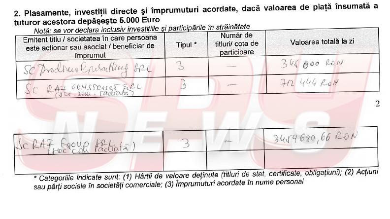 Astfel, conform declaraţiilor de avere ale Ralucăi Arşinel, director în Ministerul Afacerilor Externe, declaraţie publicată în luna august, femeia a băgat aproape 4,2 milioane de lei - "împrumuturi acordate în nume personal" - în societăţile RAF Construct ( 712.444 lei) şi RAF Group Investment (3.459.680,66 lei). Împrumuturile nu sunt noi, ele figurând şi în declaraţiile acesteia de acum trei ani. Numai că infuzia de capital nu s-a văzut deloc în afacerile soţului.