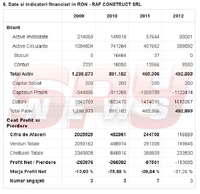 În acelaşi timp, RAF Construct are o gaură de aproape un milion de lei în perioada 2008-2012, an în care ambele firme şi-au încetat activitatea fără a returna banii primiţi împrumut.