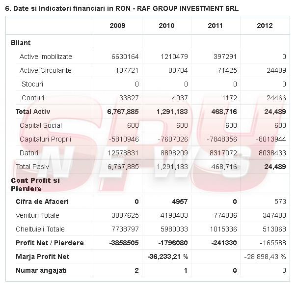 RAF Group Investment, înregistrată în ianuarie 2007, a pierdut în perioada 2009-2012, perioadă ce ar corespunde împrumuturilor amintite, aproape 6,1 milioane de lei.