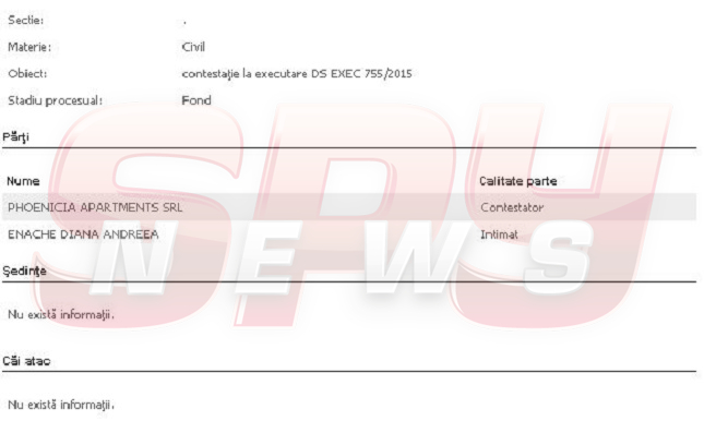 Numai că libanezul nu va plăti plăti, cel mai probabil, niciun leu din cei 50.000 de euro daune morale pe care le-a primit victima sa, Diana Enache. Asta pentru că, fiica lui Adrian Enache a decis să execute sociatatea comercială care îl avea ca angajat pe Kanaan Ali Riad. Dovadă stă contestaţia la executare pe care SC Phoenicia Apartments SRL a depus-o la Judecătoria Sectorului 1.