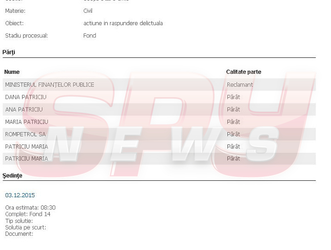 Dana, Ana şi Maria Patriciu au ajuns de aceeaşi parte a baricadei în procesul deschis pe numele lor de Ministerul Finanţelor Publice. Instituţia le cere acestora să plătească aproape 100 de milioane de euro, prejudiciul produs statului de Dinu Patriciu în dosarul Rompetrol. Cele trei - aflate într-o relaţie destul de încordată şi părţi adverse în procesul de partaj al averii lui Dinu Patriciu - sunt aşteptate mâine dimineaţă, împreună, în faţa judecătorilor Tribunalului Bucureşti.