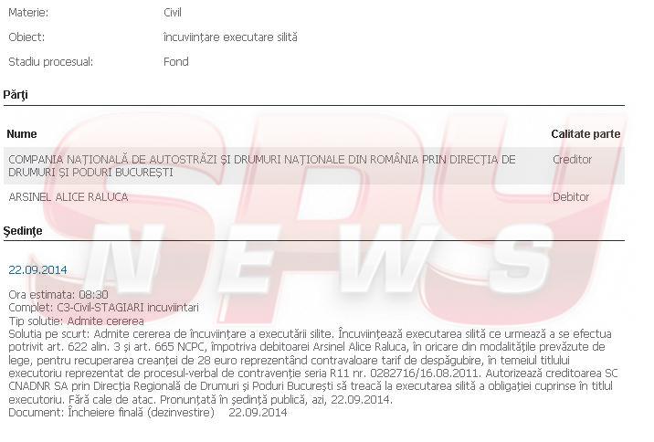 Judecătorii au admis, la începutul săptămânii, cererea de încuviinţare a executării silite "împotriva debitoarei Arşinel Alice Raluca, în oricare din modalităţile prevăzute de lege, pentru recuperarea creanţei de 28 euro reprezentând contravaloare tarif de despăgubire, în temeiul titlului executoriu reprezentat de procesul-verbal de contravenţie seria R11 nr. 0282716/16.08.2011". Este vorba - potrivit surselor noastre - despre neplata unei banale rovignete, care acum i-ar putea crea neplăceri soţiei lui Bogdan Arşinel, băiatul cel mare al actorului Alexandru Arşinel.