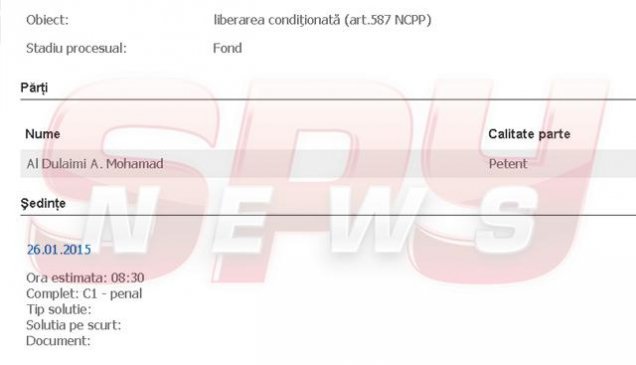 Al Dulaimi Ali Asae Mohamad a cerut în urmă cu doar câteva zile eliberarea condiționată din penitenciarul în care se află încarcerat, pe motiv că a ispășit suficiente zile din pedeapsa primită. Primul termen al procesului a fost deja stabilit pentru 26 ianuarie. El a fost condamnat anul trecut la şapte ani de pușcărie, după ce a fost acuzat de DIICOT că a înlesnit intrarea şi ieşirea din România a cinci cetăţeni irakieni care au săvârşit acte teroriste în favoarea organizaţiei Al Qaeda.