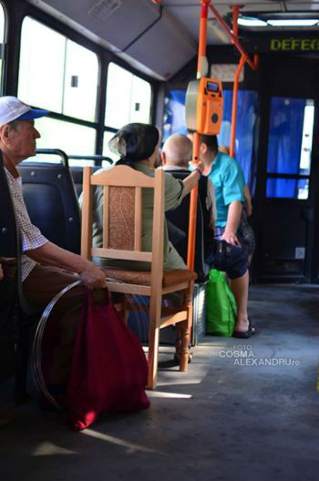 Acesta a pozat o pensionară din Capitală ce şi-a dezvoltat propria metodă prin care reuşeşte să prindă mereu loc în aglomeratele mijloace de transport. Femeia a fost fotografiată în timp ce stătea pe un scaun de bucătărie chiar în autobuz.