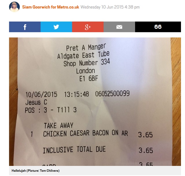 Aceştia au relatat cazul unui londonez care a avut supriza să constate că numele chelnerului care i-a adus comanda, iar ulterior, nota de plată, este un anume Iisus C.