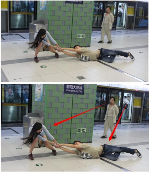 Imaginile disperării au fost surprinse într-un metrou din China. O fată ajunsă la capătul răbdării îşi târăşte iubitul la metrou încercând să îi smulgă telefonul din mână.