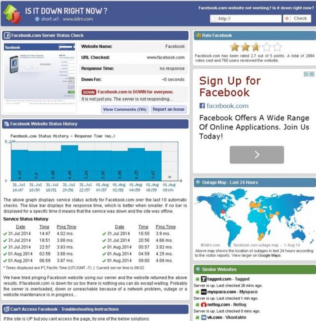 De la ora 18:59, reţeaua Facebook este nefuncţională în întreaga lume. Cei 1,11 miliarde de oameni care au cont pe această reţea n-au mai putut trimite mesaje şi n-au mai putut vedea nicio postare nouă în pagina principală a contului de Facebook.