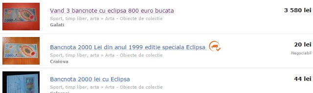 ECLIPSA de SOARE 2015. De altfel, unii comercianţi şi-au propus să tragă foloase serioase de pe urma eclipsei din 1999, astfel încât, preţul de pornire al unei bancnote cu eclipsă de 2000 de lei a atins chiar şi suma de 800 de euro, potrivit unui site de anunţuri.