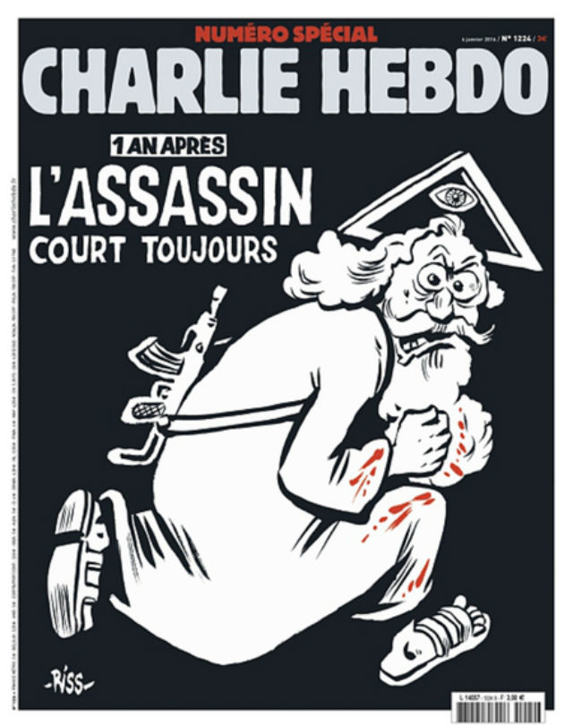 Anul acesta, revista adoptă o imagine grafică îndoliată. Coperta Charlie Hebdo la un an după atentate spune: ''Un an mai târziu, asasinul este încă în libertate''.